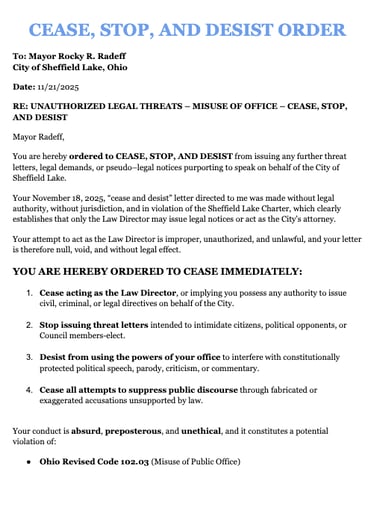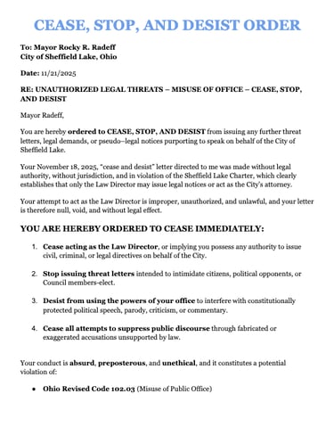 It is truly a shame that the Citizens of Sheffield Lake have to put up with this behavior of an out-of-control Mayor who has no respect for the law.