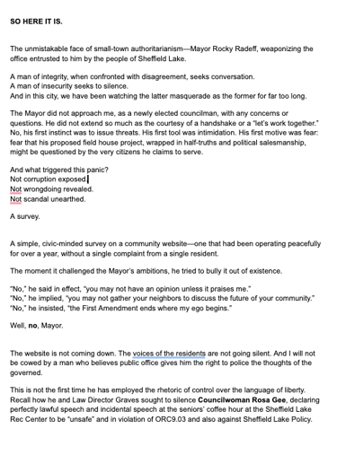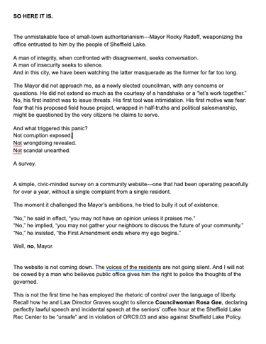 It playfully satirizes the hypersensitivities of those who zealously defend Mayor Rocky Radeff’s policies, while earnestly offering real-world proposals for improving life in Sheffield Lake.