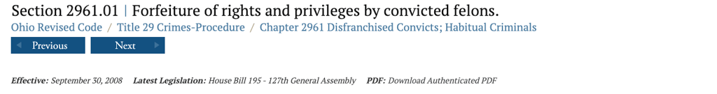 While it is not obvious to the layman 2961.01 (A)(1) spells out that a convicted felon cannot "hold an office of honor, trust, or profit." In legalese speak that means that a felon cannot hold elected office in Ohio. It is unambiguous. Additionally, paragraph (B) of the same section spells out that such a person cannot even circulate their own petition for candidacy.