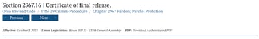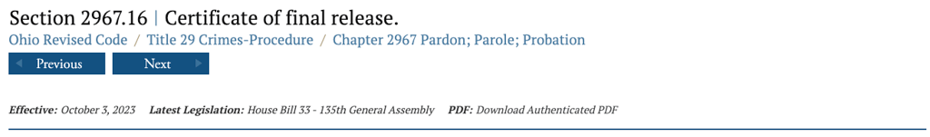 It also does not address restoration provisions in 2967.16 (certificate of final release), which explicitly restore forfeited rights unless a permanent-bar statute applies.
