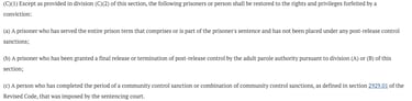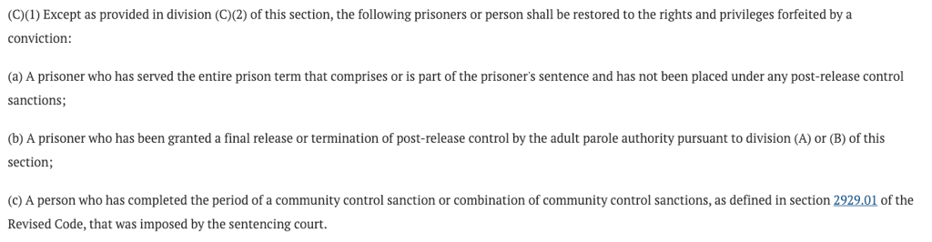 Clearly, this states that a person shall have their rights and privileges "restored" if (a) A prisoner who has served the entire prison term that comprises or is part of the prisoner's sentence and has not been placed under any post-release control sanctions; This means that if you committed a State felony in Ohio your rights are restored when you complete your sentence, probation, and make restitution and you are allowed to run for office.