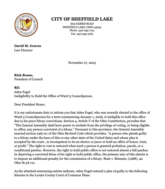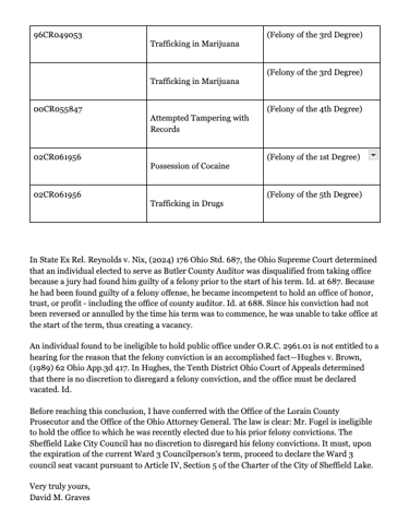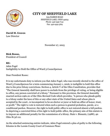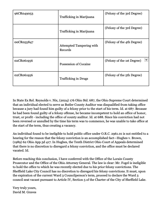 Law Director Graves has taken the outlandish and foolish approach to attempt to disenfranchise the residents of Ward 3 in Sheffield Lake by suggesting that Sheffield Lake's City Council summarily remove a wildly popular candidate, without a hearing, no less. He bases the grounds for removal on Ohio Revised Code 2961.01 - that a person who pleads guilty to a felony is incapable of holding office in the state of Ohio.
