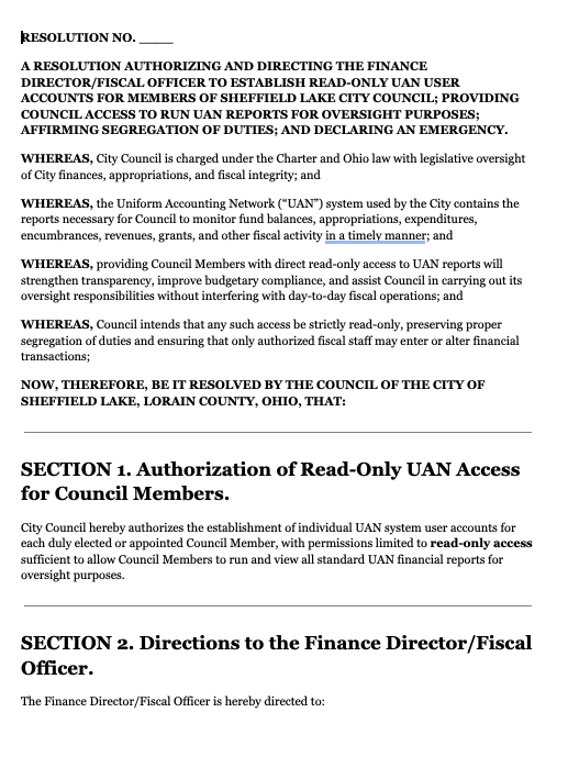 Sheffield Lake friends — as Councilman-elect, I’m introducing a simple but important resolution: give every City Council member a read-only UAN (Uniform Accounting Network) login.